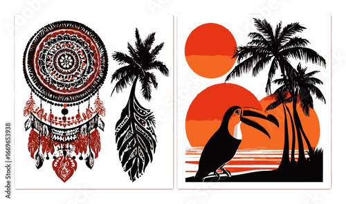 Vibrant illustration of hibiscus, sun, leaf, palm, toucan, starfish, watermelon on bold backgrounds.