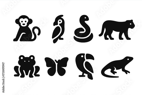 Jungle Wildlife Icons. Solid style icons of jungle wildlife: monkey, parrot, jaguar, snake, crocodile, toucan, frog, butterfly,