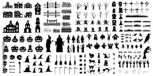A set of Halloween silhouettes of 200 elements on a white background. Set of icon for celebration. Vector illustration.