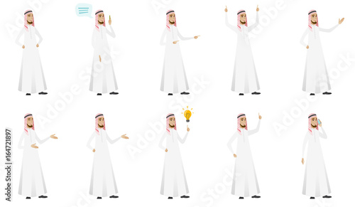 Arab Man Office Worker Vector. Arabic Traditional Clothes. Ghutra. Business Set. Facial Emotions, Gestures. Animated Elements. Corporate Businessman Male. Successful Officer, Clerk. Illustration