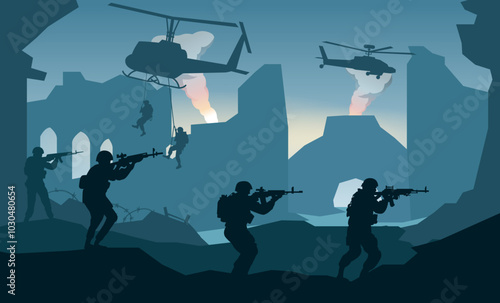Destroyed buildings on fire with helicopter illustration destruction disaster