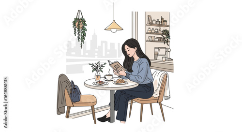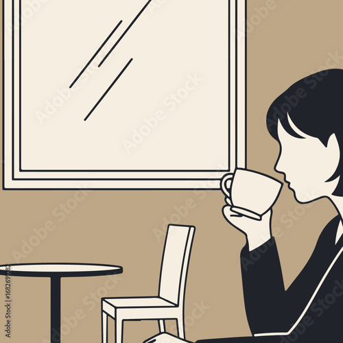 A handsome young man enjoys a relaxing coffee break at a charming outdoor cafe in the city, an elegant vector illustration