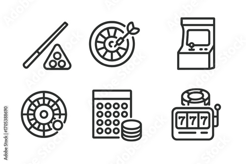 Set line Game dice, Crossed billiard cues, Table football, Time chess clock, Whirligig toy and icon. Vector