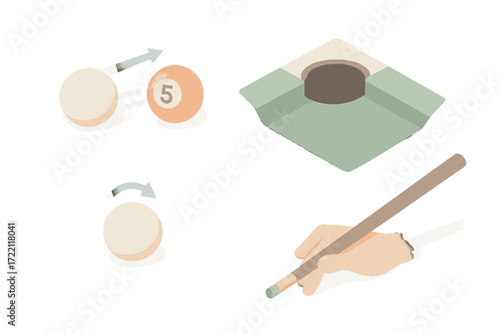 Minimal snooker cue and ball silhouette vector with white background for pool and billiard game illustration