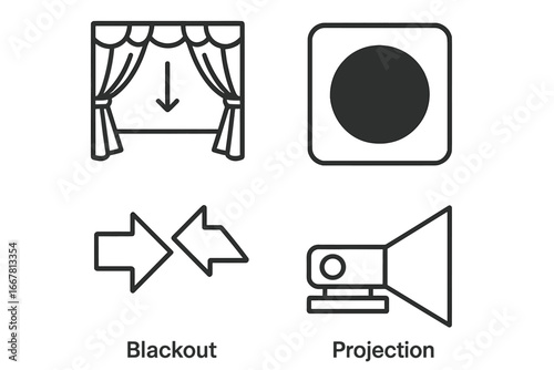 Stage Transition Icons Set. Outline Symbols for Theater and Event Cues: Curtain Rise, Blackout, Crossfade, Projection. Minimal Vector Illustration. Stage Lighting, Scene Change, Performance Concept