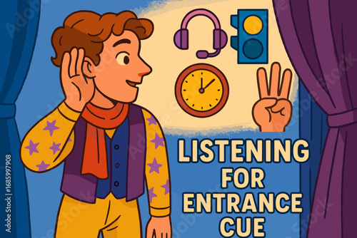 Dynamic Theater Scene. Amphitheater ? Director?s Cue. A raised hand gives the signal; cue lights blink in a tidy sequence. Notation ?Places!? springs from a