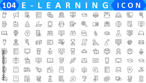 E-learning icon set for online education and distance learning. Creative symbols for university, school course, and webinar. Knowledge, technology, innovation vector icons.