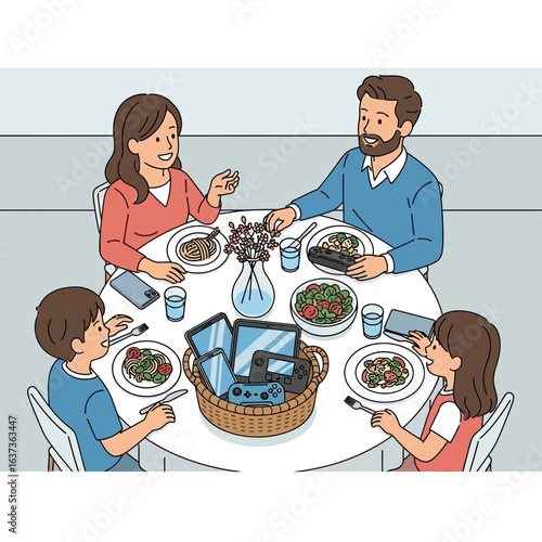 Teenager playing with mobile phone and ignoring healthy food during lunch, concept of phone addiction and unhealthy lifestyle