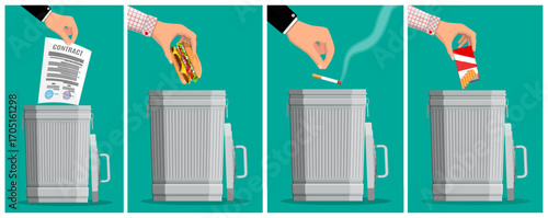 Bad habits icon set, unhealthy lifestyle, addiction awareness, smoking, alcohol, junk food, lazy behavior, stress, procrastination, negative activity vector illustration.