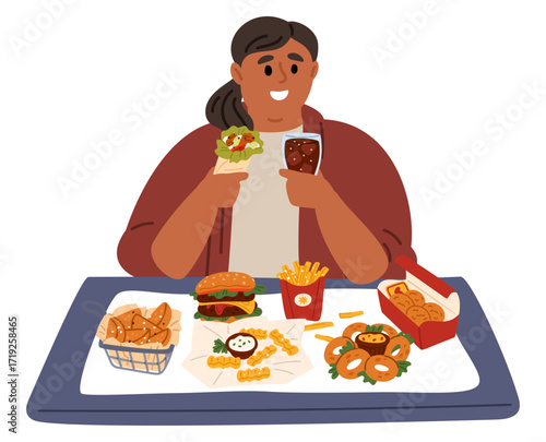 Overweight Woman Craving Junk Food Vector Concept Illustration. person obsessing over eating junk food with high sugar and cholesterol