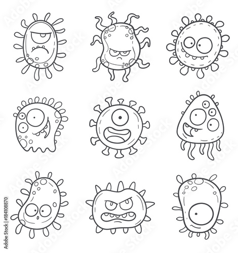 Cute bacteria, virus, germ cartoon character set. Funny monsters vector illustration isolated on a white background.