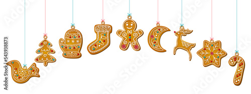 Christmas Gingerbread cookies for xmas celebration. Winter homemade sweets and biscuit in festive shapes isolated on white background. Cute flat decorated desserts. Cartoon vector illustration