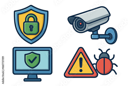 Alert Icons Red Siren, Warning Signs, Padlock, Folder, Security Shield Symbols