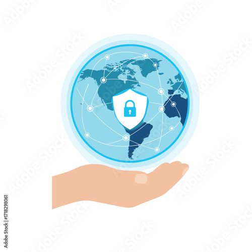 Conceptual illustration of network security, showing a central padlock shield protecting various digital assets like devices and user identity