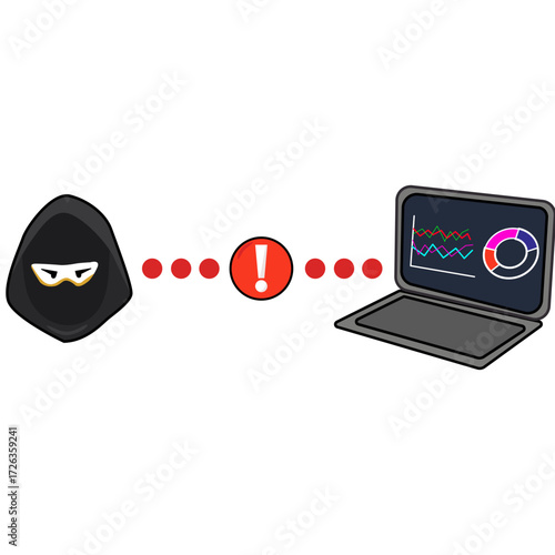 Hacker thief with laptop. Cyber attack. Vector illustration.