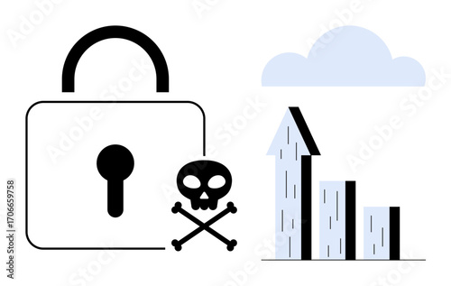 Padlock with keyhole, danger skull icon, glowing light bulb with gear, and calculator suggest secure systems, innovation, analysis, and risk. Ideal for technology, safety hacking education