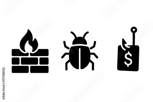 Computer Bug Icon Set in Black Vector Illustration Featuring Malware Symbols, Error Graphics, Security Alert Elements, and Modern Tech Icons for Digital Interface, Software Design, and Cyber Concept