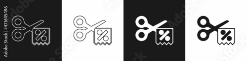 Set Scissors cuts discount coupon icon isolated on black and white background. The concept of selling in an online supermarket at low prices or half the cost. Vector