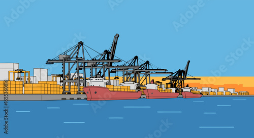 Vibrant harbor scene depicting a container ship unloading cargo at a modern port facility showcasing global commerce and logistics operation