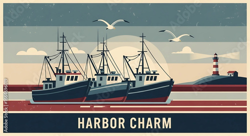 Scenic harbor town with sailboats and mountains in geometric design