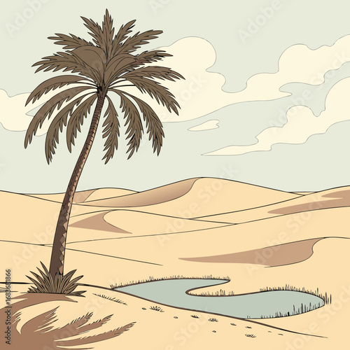 Vector art of rolling desert dunes under a bright blue sky with clouds