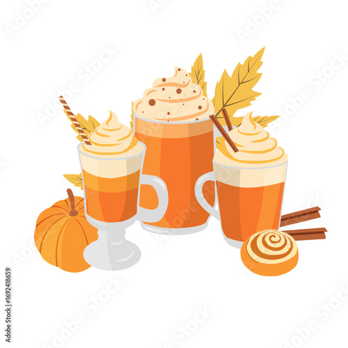 A cozy autumn collection of seasonal elements isolated on white background, featuring pumpkin, pie, mushroom, yarn, coffee, leaves, jam, hot chocolate, candle, cinnamon roll, scarf, and socks