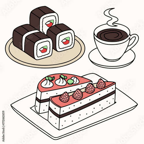 Vector illustration set of Japanese food: sushi rolls ramen noodle soup and a rice bowl with egg and chopsticks.