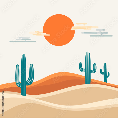 An illustration of a desert landscape featuring rolling sand dunes and saguaro cacti under a bright sun.