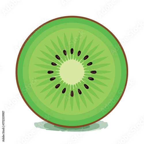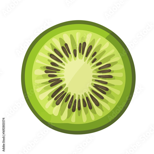 An isolated top-down view illustration of a fresh kiwi fruit slice with vibrant green pulp, white center, and black seeds.