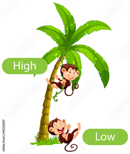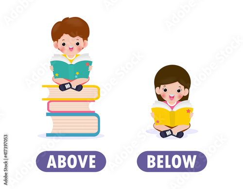 Cartoon Kids Walking Up and Down Stairs, Directional Concept with Arrows, Educational Vector Illustration for Learning Opposites and Movement