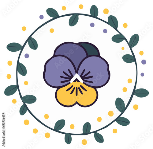 Illustration of a purple pansy flower with green leaves for botanical designs and springtime art