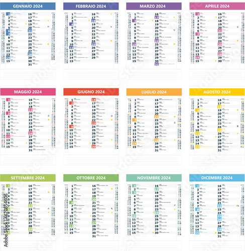 Moon calendar for 2024 year, lunar cycles planner template. Moon phases schedule, astrological lunar stages calendar banner, card, poster vector illustration