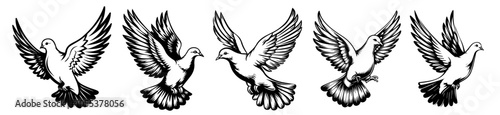 Bird silhouette vector set, black pigeon dove poses, flying perched standing, wing motion, nature graphic, wildlife illustration, design