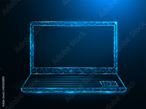 Abstract Digital PC Monitor in Low Poly Wireframe Style. Empty Screen of the Computer in Connected Glowing Dots, Lines, and Geometric Shapes. Polygonal 3D Vector Illustration on Dark Blue Background.