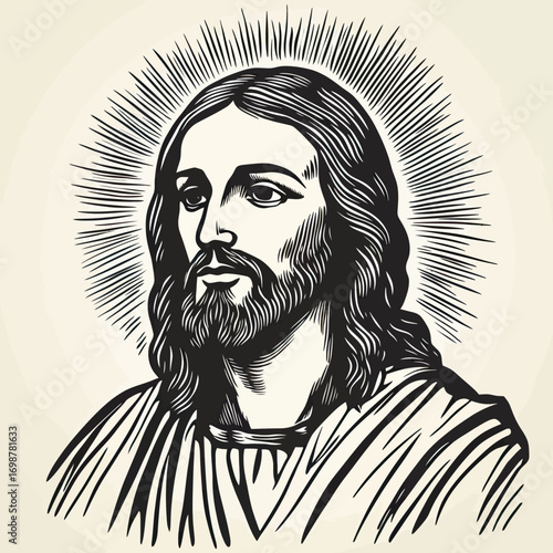 Jesus Christ portrait with radiant halo vintage woodcut engraving style vector illustration in minimalist flat black and white design for religious art and iconography