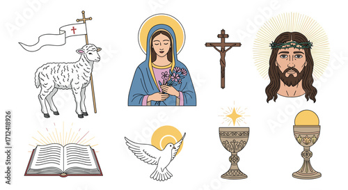Christian symbols vector illustration set with cross, dove, heart, bible, fish, and more faith icons