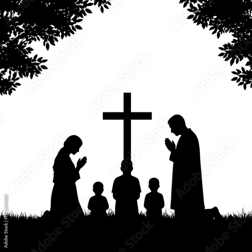 A black silhouette of a Christian cross with two doves and a floral border symbolizes peace and faith.