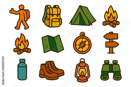 Essential hiking gear icons: backpack, compass, tent, boots, map, and more