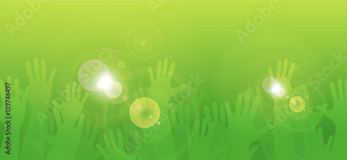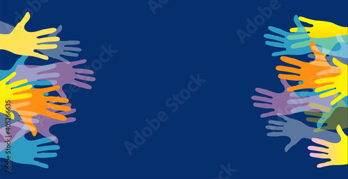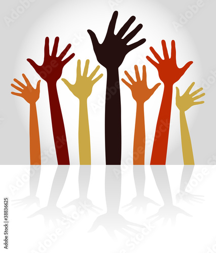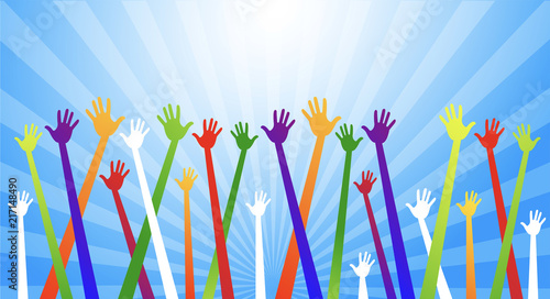 Concept de l’adhésion d’un groupe avec cinq mains tendues devant un coucher de soleil, pour symboliser l’union et la cohésion.