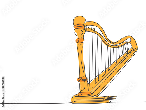 A golden harp with strings is displayed in the center.