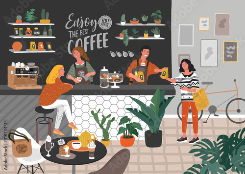 Cute bakery shop interior with fresh pastry assortment. Cartoon vector illustration of a cozy patisserie with cakes, cupcakes, bread, and sweets on display shelves and counter.
