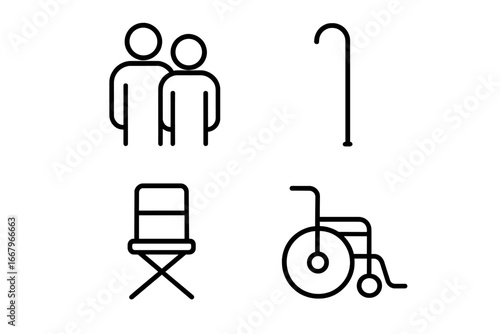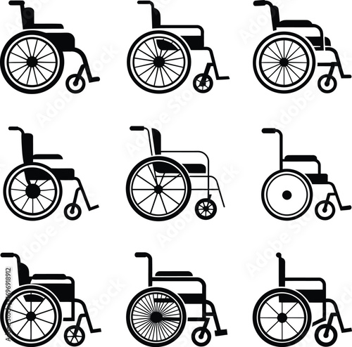 Collection of eight manual wheelchair illustrations or icons, representing healthcare, mobility, and disability support on a white background.
