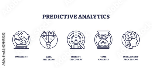 Predictive Modeling silhouette set: statistical graph, prediction engine, neural prediction nodes, accuracy chart, forecast icon, regression output, machine learning process, data