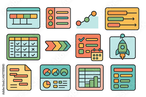 Colorful Data Visualization Icons Set with Bar Charts, Line Graphs, and Gauges