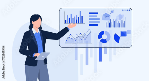 An analytical business dashboard interface featuring financial charts and statistical graphs for data visualization and performance reporting vector illustration