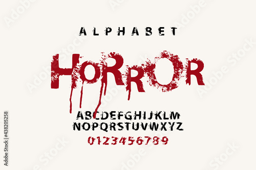 HORROR lettering in awful dripping bloody letters. Splattered Alphabet, vector set of alphabet letters and numbers on a light background. Scary font for headline, poster, label. Halloween party style