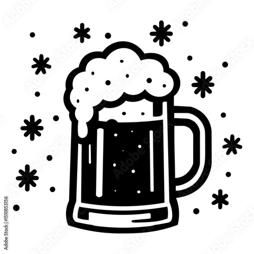 A detailed, monochrome illustration of a classic beer mug, The mug is overflowing with foamy beer, Frothy beer mugs in a vintage engraved style illustration, presented in a classic etched style