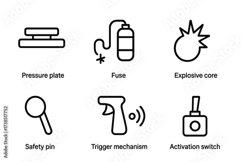 A collection of various types of vintage hand grenades and explosive devices, depicted in a black and white schematic style illustration