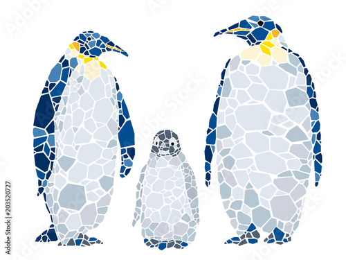 三角の旗と山の北欧風の風景、ペンギンの親と子供たちと雪の結晶のベクター白バックフレームイラスト素材