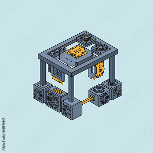 3D printer prints a Bitcoin coin out of plastic. Cryptocurrency mining. 3D printer manufacturing bitcoin cryptocurrency. Vector illustration